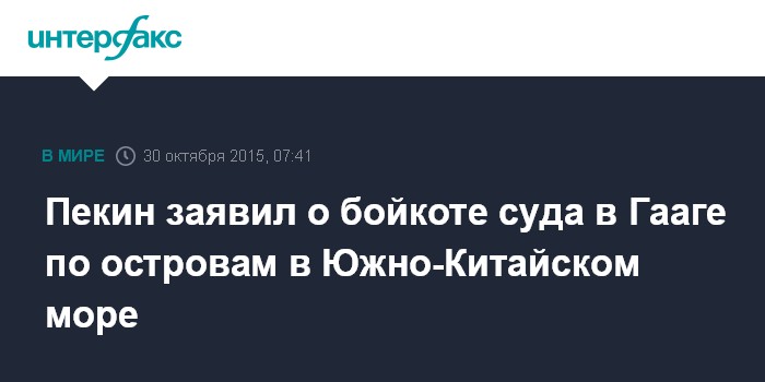 Москва. 30 октября. INTERFAX.RU - Китайская сторона не будет участвовать и не признает решение Международного арбитражного суда в Гааге, которое будет касаться территориальной принадлежности островов в Южно-Китайском море, заявил замминистра иностранных дел КНР Лю Чжэньминь.