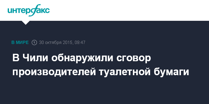 Москва. 30 октября. INTERFAX.RU - Власти Чили выдвинули против двух лесоперерабатывающих компаний обвинение в картельном сговоре, позволявшем им долгое время поддерживать высокую цену на туалетную бумагу, бумажные салфетки и полотенца.