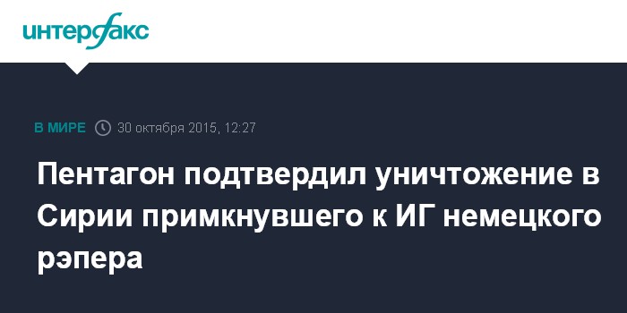 Москва. 30 октября. INTERFAX.RU - В Пентагоне подтвердили уничтожение в Сирии наиболее известного гражданина ФРГ, состоящего в группировке "Исламское государство", - рэпера Дэниса Кусперта - в результате авиаудара США. Об этом сообщает в пятницу журнал Der Spiegel.