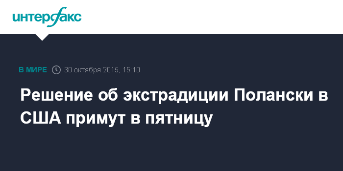 Москва. 30 октября. INTERFAX.RU - Суд Кракова, как ожидается, в пятницу должен вынести решение по делу об экстрадиции кинорежиссера Романа Полански в США, где его обвиняют в растлении несовершеннолетних. Об этом сообщает "Би-би-си".