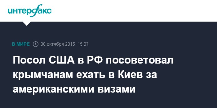 Москва. 30 октября. INTERFAX.RU - Посольство США в Москве рассмотрит на общих основаниях обращения жителей Крыма за визой, заявил глава американской димписсии в РФ Джон Теффт. Однако он уточнил, если житель Крыма имеет право получить визу без собеседования, он может это сделать только в Киеве.