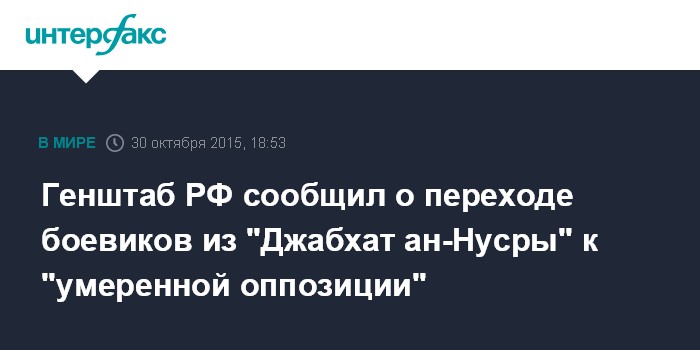 Москва. 30 октября. INTERFAX.RU - В российском Генштабе сообщают о решении ряда бандформирований из "Джабхат ан-Нусры" присоединиться к сирийской "умеренной оппозиции"