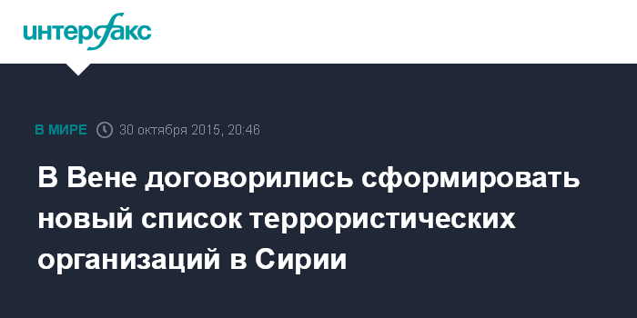 Москва. 30 октября. INTERFAX.RU - Участники министерской встрече в Вене по Сирии договорились определить список террористических организаций, которые пока не включены в перечень Совбеза ООН, для борьбы с ними, сообщил на пресс-конференции по итогам переговоров глава МИД РФ Сергей Лавров.