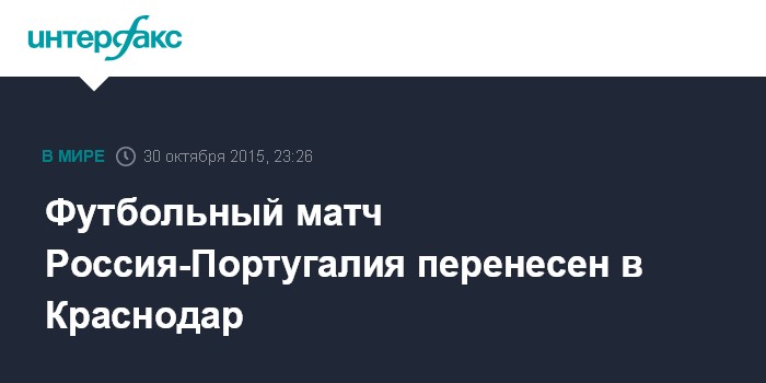 Москва. 30 октября. INTERFAX.RU - Российский футбольный союз сообщил, что товарищеский матч между национальными сборными России и Португалии состоится 14 ноября на стадионе "Кубань" в Краснодаре. Начало в 17.00, говорится на сайте РФС.