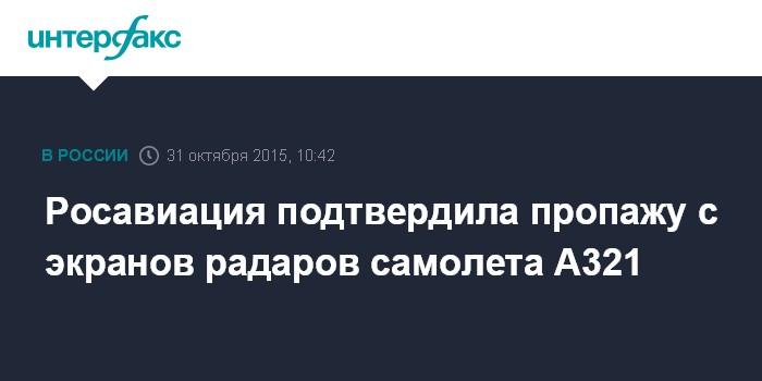 Москва. 31 октября. INTERFAX.RU - В Росавиации располагают сведениями об исчезновении с экранов радаров самолета А321, летевшего из Египта в Санкт-Петербург.