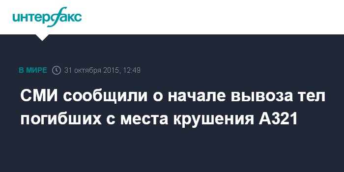 Москва. 31 октября. INTERFAX.RU - Египетские спасатели приступили к вывозу тел погибших с места падения российского пассажирского авиалайнера на Синайском полуострове, сообщают западные СМИ.