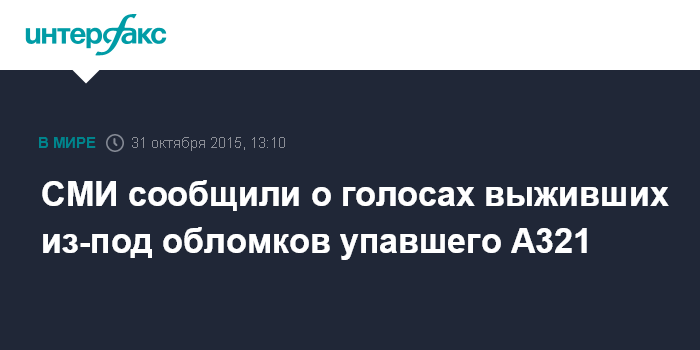 Москва. 31 октября. INTERFAX.RU - Голоса выживших людей слышны из-под обломков российского пассажирского самолета, разбившегося на Синайском полуострове, сообщает западные СМИ.