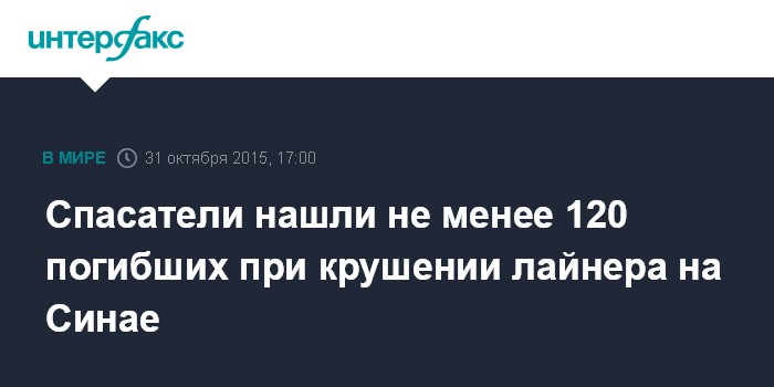 Москва. 31 октября. INTERFAX.RU - Египетские спасатели, работающие на месте крушения российского самолета авиакомпании "Когалымавиа" на Синайском полуострове, обнаружили в обломках лайнера целыми, по меньшей мере, 120 тел, сообщили СМИ представители службы безопасности Египта.
