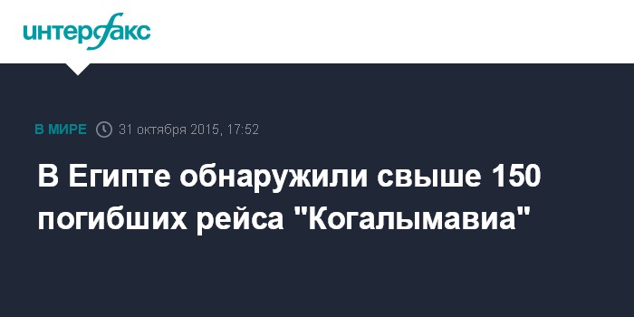 Москва. 31 октября. INTERFAX.RU - По последним данным, египетские спасатели, работающие на месте крушения российского самолета на Синайском полуострове, обнаружили тела более 150 погибших, сообщили СМИ представители службы безопасности Египта.