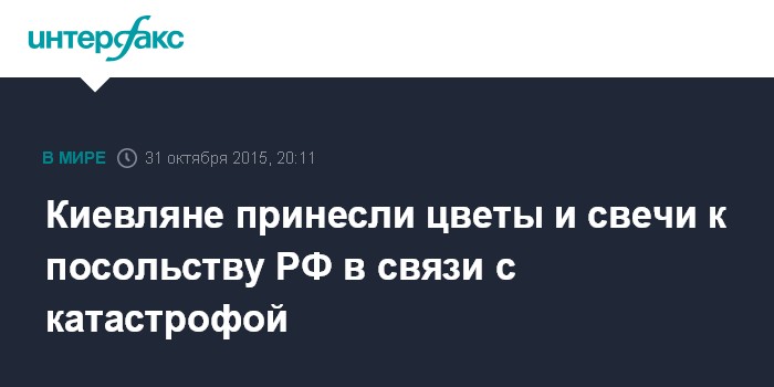 Москва. 31 октября. INTERFAX.RU - Жители Киева в субботу вечером несут цветы и зажигают лампадки у посольства РФ на Воздухофлотском проспекте в связи с катастрофой авиалайнера компании "Когалымавиа" в Египте, на борту которого находилось 224 человека.