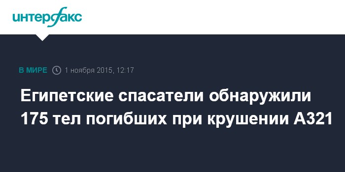 Москва. 1 ноября. INTERFAX.RU - Отряды египетских спасателей, работающих на месте катастрофы российского пассажирского самолета авиакомпании "Когалымавиа" на севере Синайского полуострова, обнаружили тела 175 погибших, сообщило издание Youm7, ссылаясь на представителей египетской службы безопасности.