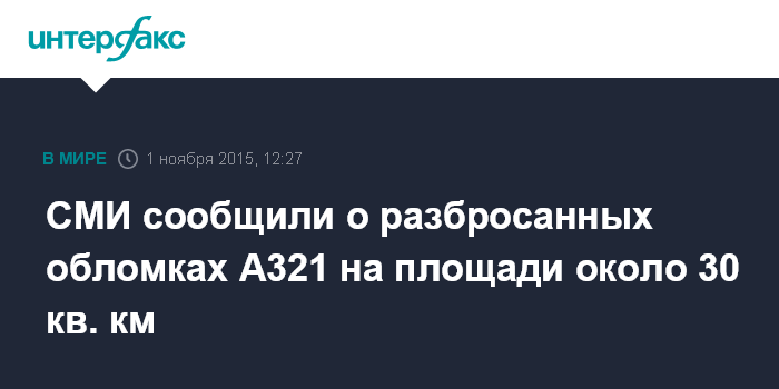 Москва. 1 ноября. INTERFAX.RU - Обломки российского А321, разбившегося на Синае, разбросаны на территории примерно в 30 кв.км, сообщил в эфире телеканала "Россия-24" корреспондент, находящийся на месте происшествия.