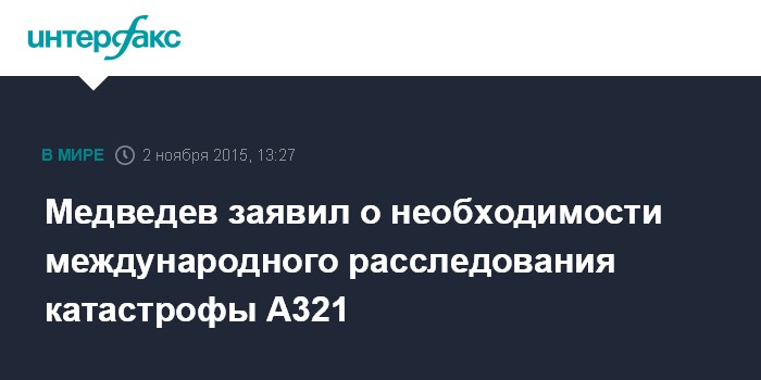 Москва. 2 ноября. INTERFAX.RU - Премьер РФ Дмитрий Медведев заявил о необходимости привлечения международных экспертов к расследованию катастрофы аэробуса А321.