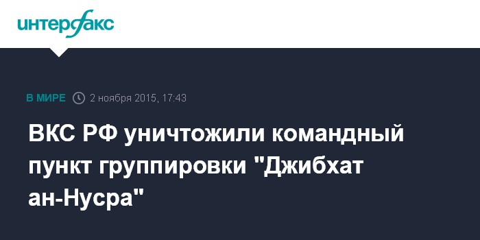Москва. 2 ноября. INTERFAX.RU - Авиация ВКС РФ уничтожила командный пункт крупного бандформирования группировки "Джибхат ан-Нусра", находящийся на тактически важной высоте, в провинции Латакия, отметил официальный представитель Минобороны РФ генерал-майор Игорь Конашенков.