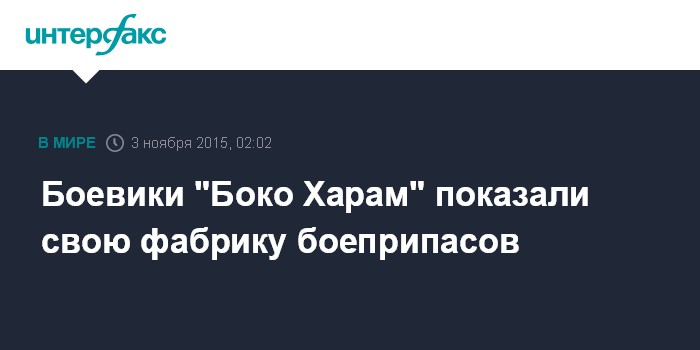 Москва. 3 ноября. INTERFAX.RU - Группировка "Боко Харам" опубликовала фотографии, на которых, судя по всему, запечатлена фабрика по производству боеприпасов на северо-востоке Нигерии, сообщает "Би-би-си".