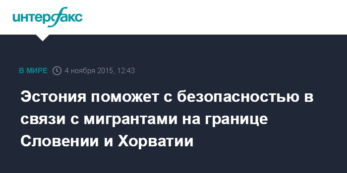 Москва. 4 ноября. INTERFAX.RU - Эстония направит в среду в Словению отряд из 25 полицейских, который в составе миссии ESTPOL1 окажет помощь в решении проблем беженцев на словенско-хорватской границе.