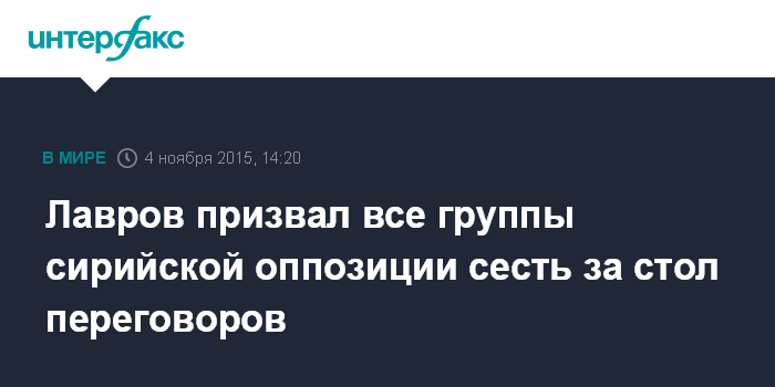 Москва. 4 ноября. INTERFAX.RU - Глава МИД России Сергей Лавров заявил о необходимости сирийской оппозиции сформировать единую делегацию для переговоров с Дамаском.