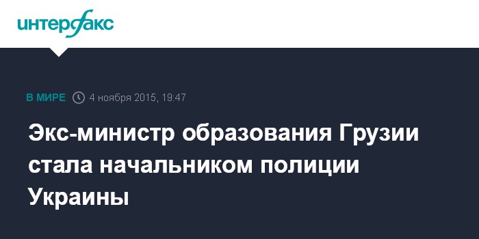 Москва. 4 ноября. INTERFAX.RU - Экс-министр образования Грузии Хатия Деканоидзе назначена начальником Национальной полиции Украины. Соответствующее постановление принято на заседании Кабинета министров в среду вечером. Представление внес премьер Арсений Яценюк по предложению главы МВД Арсена Авакова.