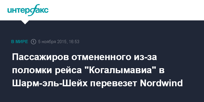 Москва. 5 ноября. INTERFAX.RU - Согласно информации онлайн-табло аэропорта "Пулково", вылет рейса Петербург - Шарм-эш-Шейх 7К 9267 авиакомпании "Когалымавиа" в четверг отменен.