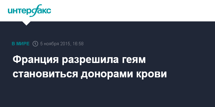 Москва. 5 ноября. INTERFAX.RU - Гомосексуалисты теперь смогут становиться донорами крови во Франции, сообщает журнал Time.
