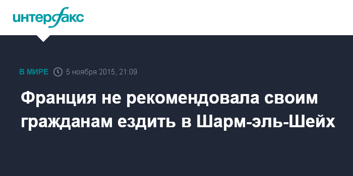 Москва. 5 ноября. INTERFAX.RU – Французские власти не советуют гражданам страны посещать город Шарм-эль-Шейх в Египте после авиакатастрофы на Синае, сообщает в четверг французский телеканал BFMTV со ссылкой на заявление МИД Франции.