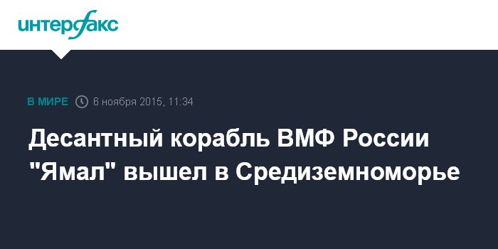 Москва. 6 ноября. INTERFAX.RU - Большой десантный корабль Черноморского флота "Ямал" в четверг проследовал из Черного моря через турецкие проливы в акваторию Средиземного моря, сообщают местные информационные порталы, публикующие фотографии его прохождения через Босфор.
