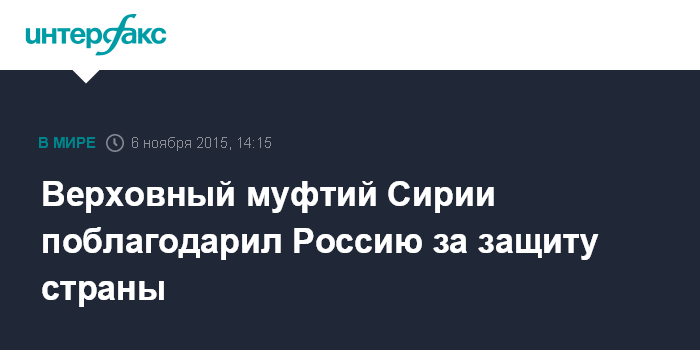 Москва. 6 ноября. INTERFAX.RU - Верховный муфтий Сирии Ахмад Бадреддин Хассун благодарен России за военную операцию в его стране.