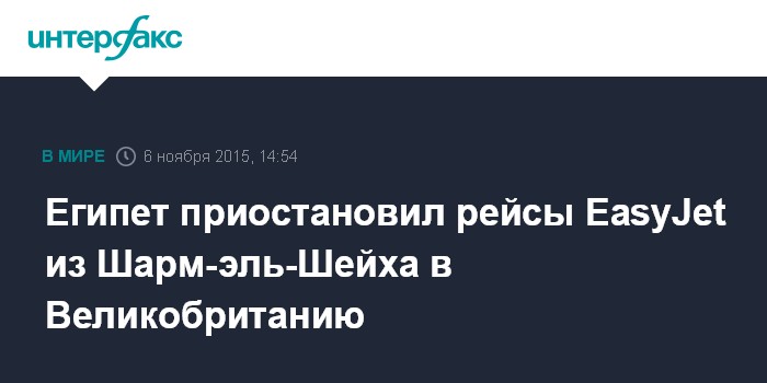 Москва. 6 ноября. INTERFAX.RU - Власти Египта приостановили выполнение рейсов авиакомпании EasyJet, на которых планировалось срочно вывезти британцев из египетского города Шарм-эль-Шейха, объявили в пятницу в компании.