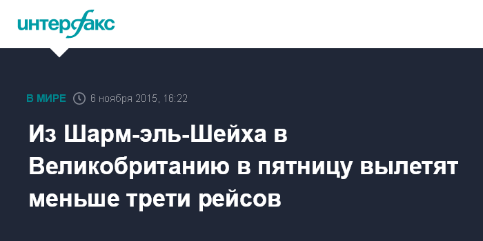 Москва. 6 ноября. INTERFAX.RU - Авиакомпании в пятницу смогут выполнить лишь восемь из запланированных 29 рейсов из Шарм-эль-Шейха в Великобританию, сообщил в египетский министр гражданской авиации Хосам Камаль.
