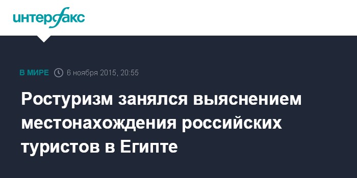 Москва. 6 ноября. INTERFAX.RU - Федеральное агентство по туризму в оперативном режиме выясняет, сколько на данный момент российских туристов пребывает в Египте, устанавливает местонахождение каждого конкретного человека, чтобы обеспечить условия для его доставки в Россию, сообщил сайт ведомства в пятницу.