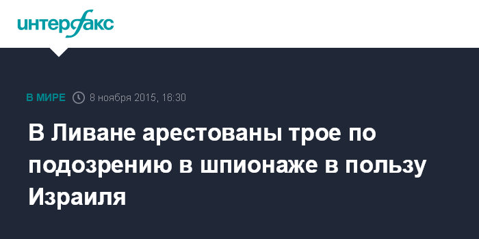 Москва. 8 ноября. INTERFAX.RU - Власти Ливана арестовали на юге страны двух ливанских граждан и одного сирийца по подозрению в шпионаже, сообщает в воскресенье сайт израильского издания The Jerusalem Post.