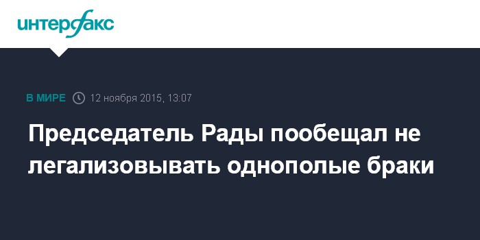 Москва. 12 ноября. INTERFAX.RU - Председатель Верховной рады Украины Владимир Гройсман заверяет, что парламент не пойдет на легализацию в стране однополых браков.