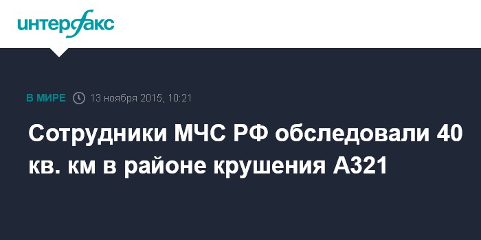 Москва. 13 ноября. INTERFAX.RU - Спасатели МЧС России продолжают поисковую операцию в районе авиакатастрофы в Египте, к настоящему моменту обследовано 40 кв. км пустыни, заявил глава МЧС РФ Владимир Пучков.