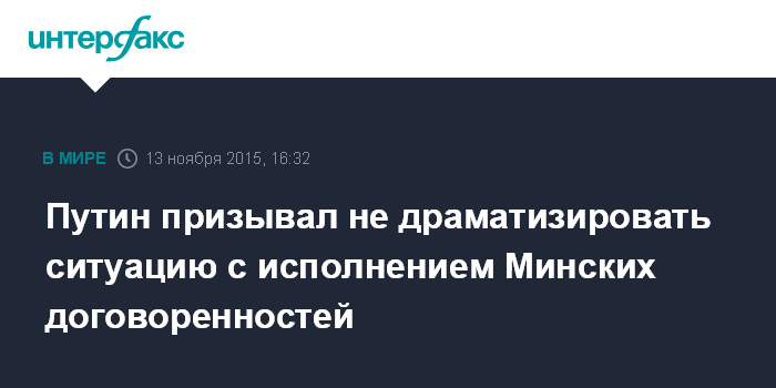"Не стал бы излишне драматизировать ситуацию с затяжкой исполнения Минских договоренностей. Несмотря на определенные сложности, они реализуются, и главное, что положения, принципы и логика документа не ставятся под сомнение", - сказал Путин в интервью информационным агентствам "Интерфакс" и "Анадолу".