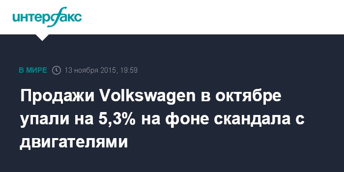 Москва. 13 ноября. INTERFAX.RU - Германский автопроизводитель Volkswagen AG сократил продажи автомобилей одноименной марки в октябре 2015 года на 5,3% в годовом выражении на фоне скандала с занижением показателей выбросов в дизельных автомобилях.