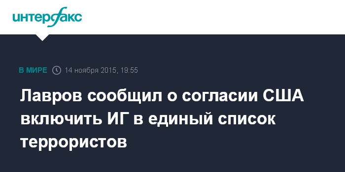 Москва. 14 ноября. INTERFAX.RU - С США есть согласие о включении в единый список террористических организаций ИГИЛ (запрещена в России - ИФ) и "Джабхат ан-Нусра", в перечень должны попасть другие террористически группировки, заявил глава МИД России Сергей Лавров.