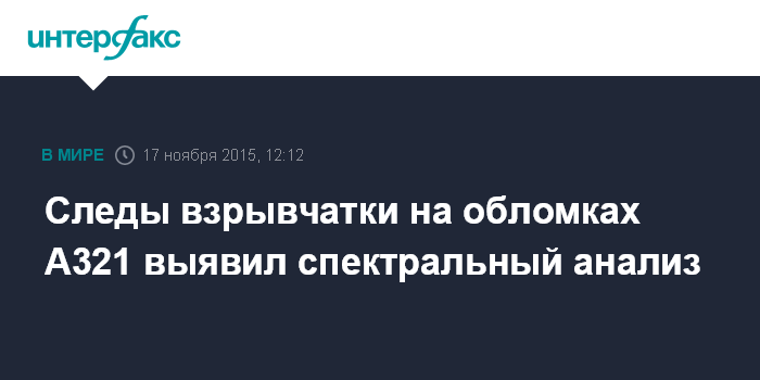 Москва. 17 ноября. INTERFAX.RU - Криминалисты, работавшие на месте крушения российского А321 на Синае, прибегли к методу спектрального анализа для подтверждения наличия следов взрывчатки, сообщил "Интерфаксу" источник, знакомый с ситуацией.