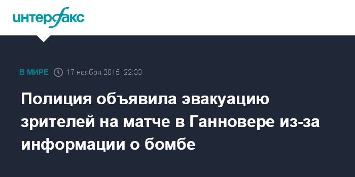 Ранее на стадионе была проведена эвакуация болельщиков. Сообщалось и об эвакуации зрителей еще на одном стадионе в Ганновере, где этим вечером должен был пройти концерт поп-группы Sohne Mannheims