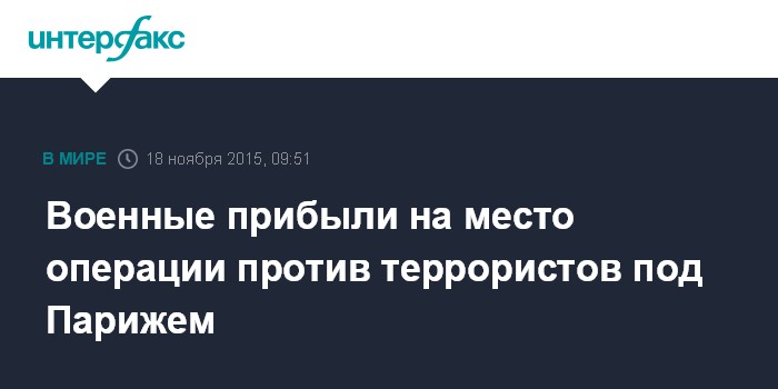 Москва. 18 ноября. INTERFAX.RU - Группа военных переброшена в среду утром в пригород Парижа Сен-Дени, где проходит операция полицейского спецназа против предполагаемых террористов, сообщает радиостанция RTL.