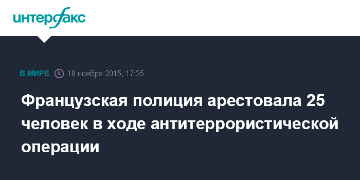 Москва. 18 ноября. INTERFAX.RU - Сотрудники французской полиции в ночь на среду провели на территории страны 118 обысков и взяли под стражу 25 человек, сообщает сайт парижской газеты Le Figaro со ссылкой на данные властей.