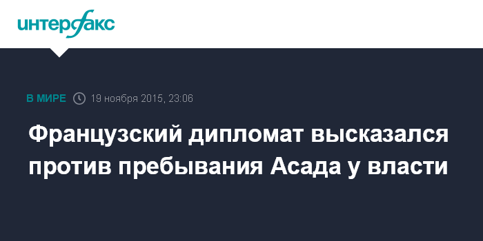 Москва. 19 ноября. INTERFAX.RU - Франция не считает дальнейшее пребывание у власти президента Сирии Башара Асада частью решения кризиса в этой стране, написал в своей статье для газеты "Коммерсант" посол Франции в Москве Жан-Морис Рипер.