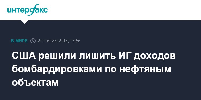 Москва. 20 ноября. INTERFAX.RU - США в борьбе с "Исламским государством" (ИГ, запрещено в РФ) сфокусировались на уничтожении контролируемых террористической группировкой энергетических и иных объектов, которые трудно будет восстановить, сообщил спецпосланник госдепа по международным энергетическим вопросам Амос Хокстайн.