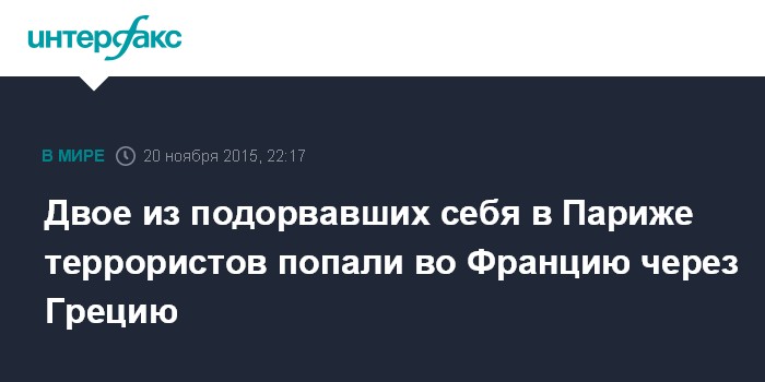 Москва. 20 ноября. INTERFAX.RU - Двое из трех смертников, которые подорвались близ стадиона "Стад де Франс" в Париже, были зарегистрированы в Греции как беженцы, спасающиеся от сирийского конфликта, сообщил в пятницу прокурор Парижа Франсуа Молен.