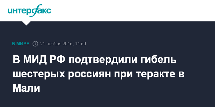 Москва. 21 ноября. INTERFAX.RU - В МИД РФ сообщили, что в результате теракта в столице Мали 20 ноября погибли шестеро граждан России, еще шестеро россиян были освобождены.