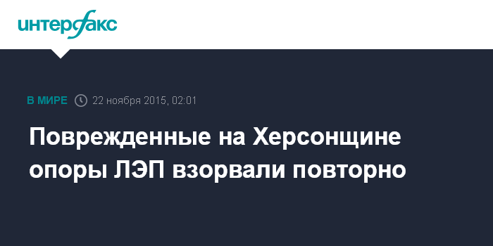 Москва. 22 ноября. INTERFAX.RU - Поврежденные ранее взрывом опоры линии высоковольтных передач, поставляющие в Крым электроэнергию, были повторно подорваны в ночь на воскресенье, сообщает активист Осман Пашаев.