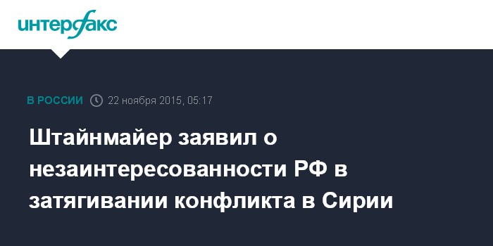 Москва. 22 ноября. INTERFAX.RU - По мнению министра иностранных дел Германии Франка-Вальтера Штайнмайера, Россия не стремится к затягиванию конфликта в Сирии и ищет пути его урегулирования.