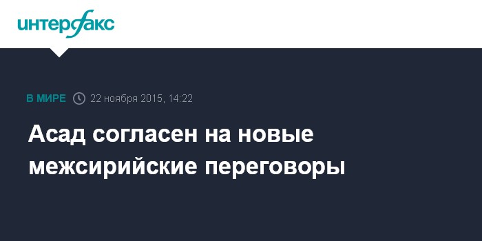 Москва. 22 ноября. INTERFAX.RU - В Дамаске согласны на проведение новых межсирийских переговоров, так как осознают необходимость диалога для решений конфликта в Сирии, заявил в воскресенье сирийский президент Башар Асад.