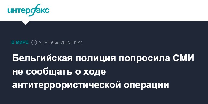 Москва. 23 ноября. INTERFAX.RU - Полиция Бельгии распространила вечером в воскресенье в твиттере призыв к средствам массовой информации и к широкой публике из соображений безопасности "соблюдать молчание в эфире, в социальных сетях" относительно полицейских операций, проводящихся в ночь на понедельник в Брюсселе.