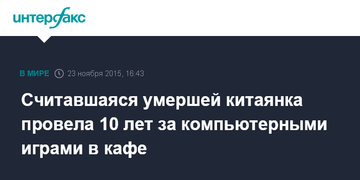 Москва. 23 ноября. INTERFAX.RU - Пропавшая десять лет назад и считавшаяся умершей китаянка была найдена полицией в интернет-кафе за прохождением компьютерной игры, сообщает издание The Star Online.