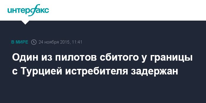 Москва. 24 ноября. INTERFAX.RU - Один из пилотов сбитого у границы с Турцией истребителя найден и задержан силами местных туркоманов, сообщается на сайте газеты Hurriyet со ссылкой на турецкий CNN. Ведутся поиски второго летчика.